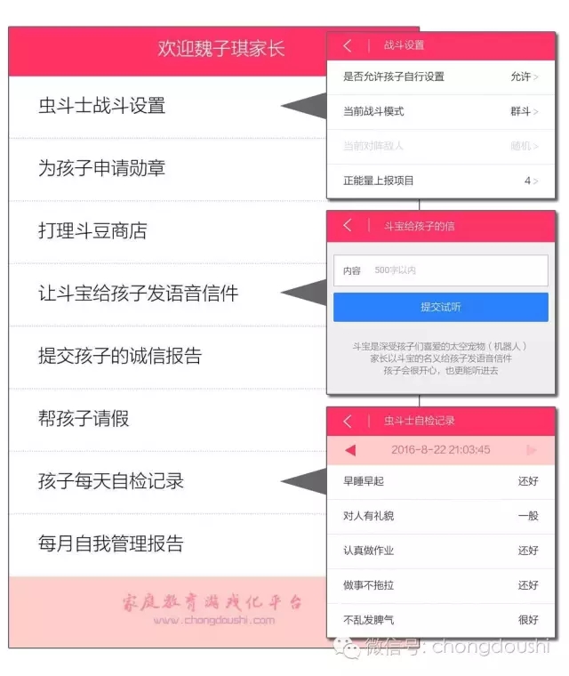 虫斗士战斗系统完成华丽升级,新系统堪称儿童版微信,界面更清爽,功能更强大。 新系统增加了家长管理后台,家长可以进行战斗设置、申请勋章、查看孩子的训练报告等。 家长管理后台进入方法:打开虫斗士微信公众号(chongdoushi),点下方菜单里的[家长后台](在战斗系统微信版入口的旁边) 除了原来的微信版以外,还有界面一致的APP版哦。查看APP的安装设置方法